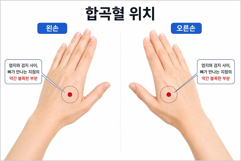 영상에서 소개된 것처럼 손등의 합곡혈을 자극하는 방식은 간단하고 빠르게 시도할 수 있습니다. 위 이미지처럼 엄지와 검지 사이, 살짝 들어간 부위를 반대쪽 엄지(또는 면봉 등)로 눌러주면 됩니다.